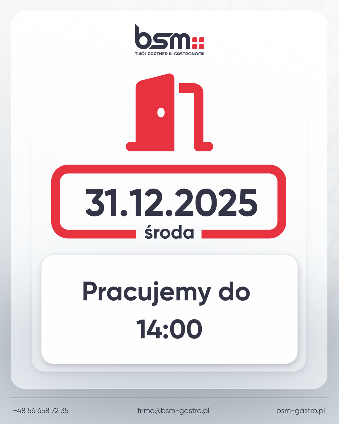 Uprzejmie informujemy, że w dniu 31 grudnia biuro BSM – Twój partner w gastronomii będzie czynne 🕑 do godziny 14:00.