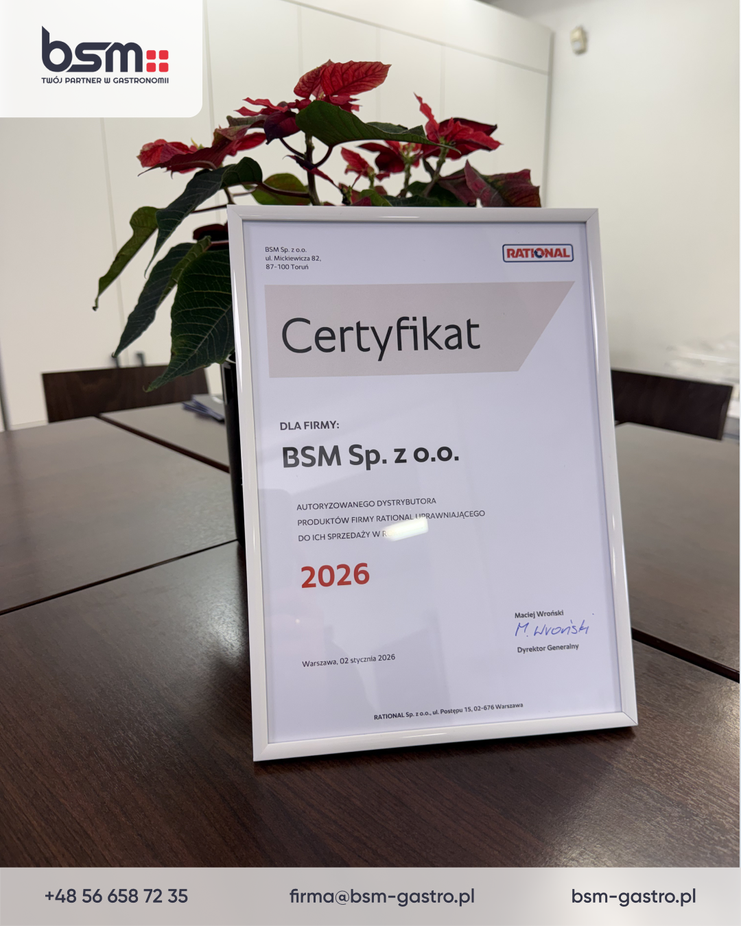 Jako BSM - Twój partner w gastronomii po raz kolejny otrzymaliśmy od firmy RATIONAL certyfikat Autoryzowanego Dystrybutora produktów RATIONAL na rok 2026.